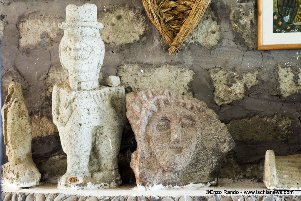 La costruzione della prima sedia (anch’essa rigorosamente in pietra) ispirò improvvisamente Rodolfo, vittima consapevole di un autentico colpo di genio: dalla roccia abbondante potevano venir fuori delle autentiche opere d’arte, delle sculture in pietra viva. Per l’esattezza, sono addirittura 150 le opere scultoree di vario soggetto che adornano oggi le pareti e gli angoli di quest’incantevole oasi, imprescindibile punto di sosta per chi sale e per chi scende dall’Epomeo. Tra i lavori artistici più notevoli annoveriamo un Cristo in pietra pomice ed una grande chitarra, che pare di tanto in tanto rilasciare nell’aria qualche nota leggiadra. Fanno da pendant alle sculture i coloratissimi quadri della madre di Francesco, Giovanna d’Abundo, donna dal gusto vivace e dai tratti naïf. “In queste composizioni si avverte tutta la gioia, tutto l’estro creativo di mia madre – racconta Francesco. Come è facile intendere, insomma, ho voluto conservare in questo posto il ricordo dei miei genitori, lasciando intatto il loro entusiasmo e la passione viva delle loro creazioni”.