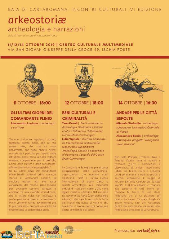 Archeologia e narrazione, letteratura e storia. A due passi dai resti del porto sommerso di Aenaria, che continua a rivelare mirabilie accendendo i riflettori su una fase fin qui ignota del millenario passato dell’isola d’Ischia, tornano gli “Incontri Culturali della Baia di Cartaromana” con un sesto ciclo dal titolo evocativo, Arkeostoriæ: tre appuntamenti, dall’11 al 14 ottobre, che pongono l’archeologia al centro di tipologie narrative che integrano e ampliano oggetti di indagine, campi di interesse, processi di valorizzazione, applicazioni. La rassegna è curata dall’archeologa Alessandra Vuoso con la cooperativa Marina di Sant'Anna di Ischia e in collaborazione con l'associazione Archeologica: appuntamento presso il Centro culturale multimediale di via San Giovan Giuseppe a Ischia Ponte.