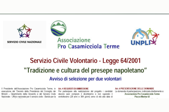 Tutti i giovani dai 18 ai 28 anni, in possesso di diploma di maturità, possono partecipare al progetto “Tradizione e cultura del presepe napoletano”, elaborato dall’Unione Nazionale delle Pro Loco, sezione provinciale di Napoli, a cui l’Associazione Pro Casamicciola Terme aderisce.