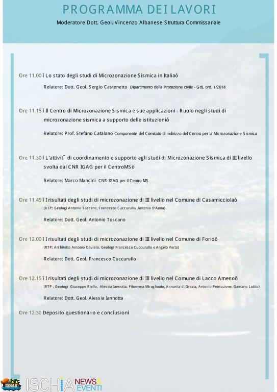 Si terrà il 6 agosto 2019, alla presenza del Sottosegretario alla Presidenza del Consiglio dei Ministri, Sen. Vito Crimi e delle Istituzioni Locali, presso l’Auditorium “Leonardo Carriero” – Lacco Ameno, la presentazione pubblica degli esiti di microzonazione sismica di III livello dei territori dell’isola d’Ischia interessati dal sisma del 21 agosto 2017, a cura del Commissariato Straordinario per la ricostruzione in collaborazione con l’Istituto Geologia Ambientale Geoingegneria del Consiglio Nazionale delle ricerche (CNR – IGAG), il Centro per la microzonazione sismica e le sue applicazioni (CNR – MS) e i Comuni di Casamicciola Terme, Lacco Ameno e Forio. I lavori avranno inizio alle ore 11,00 e termineranno, presumibilmente, alle ore 14,00.