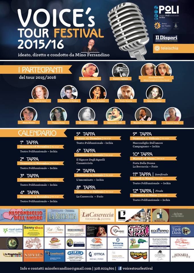 E' cominciato il conto alla rovescia............-9 e si alzera' il sipario sul Tour piu' emozionante di Ischia! VOICES TOUR FESTIVAL 2015/16 -9 GIORNI - 1° Tappa Domenica 08 Novembre Teatro Polifunzionale - Ischia inizio ore 21:30 Per info e prenotazioni tickets: 328.0224601
