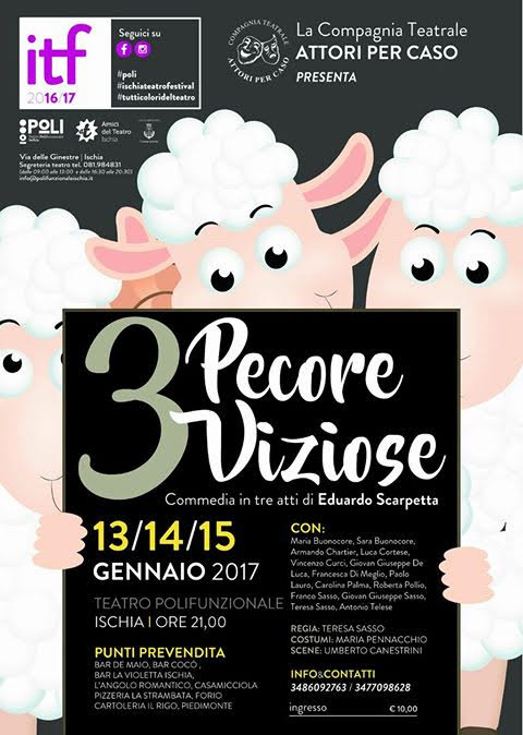 Gli Attori per Caso in scena il 13, 14 e 15 gennaio ore 21:00 Teatro Polifunzionale Ischia, con un classico del teatro napoletano: Tre pecore viziose. Stupisce sempre nelle rappresentazioni di Eduardo Scarpetta, che ormai possiamo ben dire nei secoli si sono susseguite, una macchina comica perfetta che lascia lo spettatore sempre divertito, questa commedia basa la sua comicità sugli intrecci e gli equivoci tipici della commedia dell’arte.
