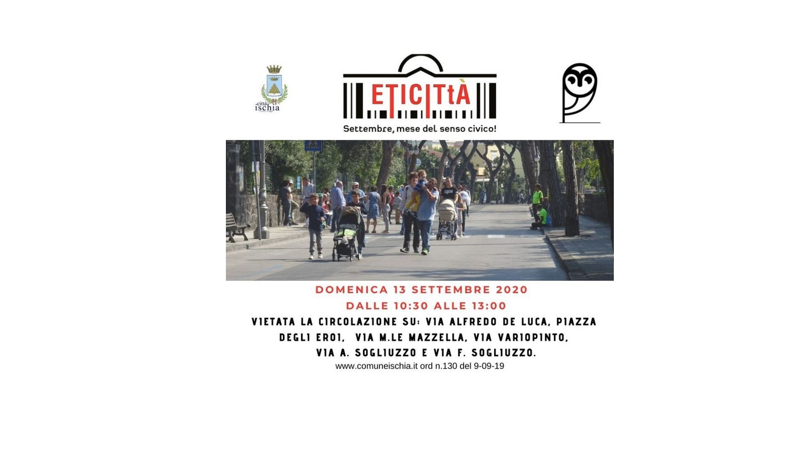 Domenica 13 settembre, nell'ambito dell'iniziativa "settembre mese del senso civico", promossa dal festival La filosofia, il Castello e la Torre, stop ai motori per le vie del centro del Comune d'Ischia.
