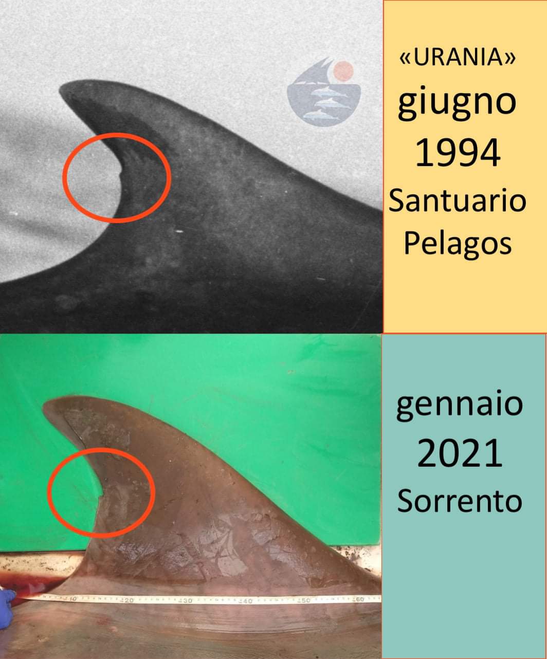 La pinna dorsale ha una tacca molto caratteristica, presente anche in un individuo fotografato nel giugno 1994 dai ricercatori di Tethys a bordo della nave “Urania” durante una spedizione assieme all’ITBA del CNR al largo della Costa Azzurra, e chiamato in onore della nave. "Purtroppo non possiamo avere la certezza assoluta dell’identificazione perché la balenottera morta aveva ormai perso gran parte della pelle-dice Maddalena Jahoda del Tethys-Oltre alla forma della pinna dorsale, gli individui di questa specie si identificano anche da chevron e blaze, le caratteristiche sfumature bianche dietro alla testa, sul lato destro, variabili da individuo a individuo. La pinna dorsale però, fotografata dagli esperti del CERT che hanno eseguito di recente la necroscopia, paragonata a quella dell’animale avvistato 26 anni fa, fa pensare ragionevolmente che, purtroppo, abbiamo perso una “vecchia” conoscenza.".