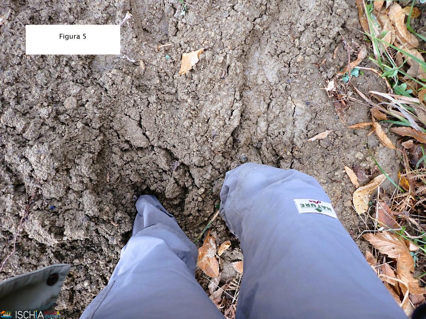 Andando verso Cava Sinigallia si trovano diverse frane e alcune che sono prossime a staccarsi (Figura 3, 4). I terreni sono comunque saturi di acqua ed in alcuni casi ancora più di quelli accertati ieri in zona Celario, sembrano sabbie mobili (Figura 5).