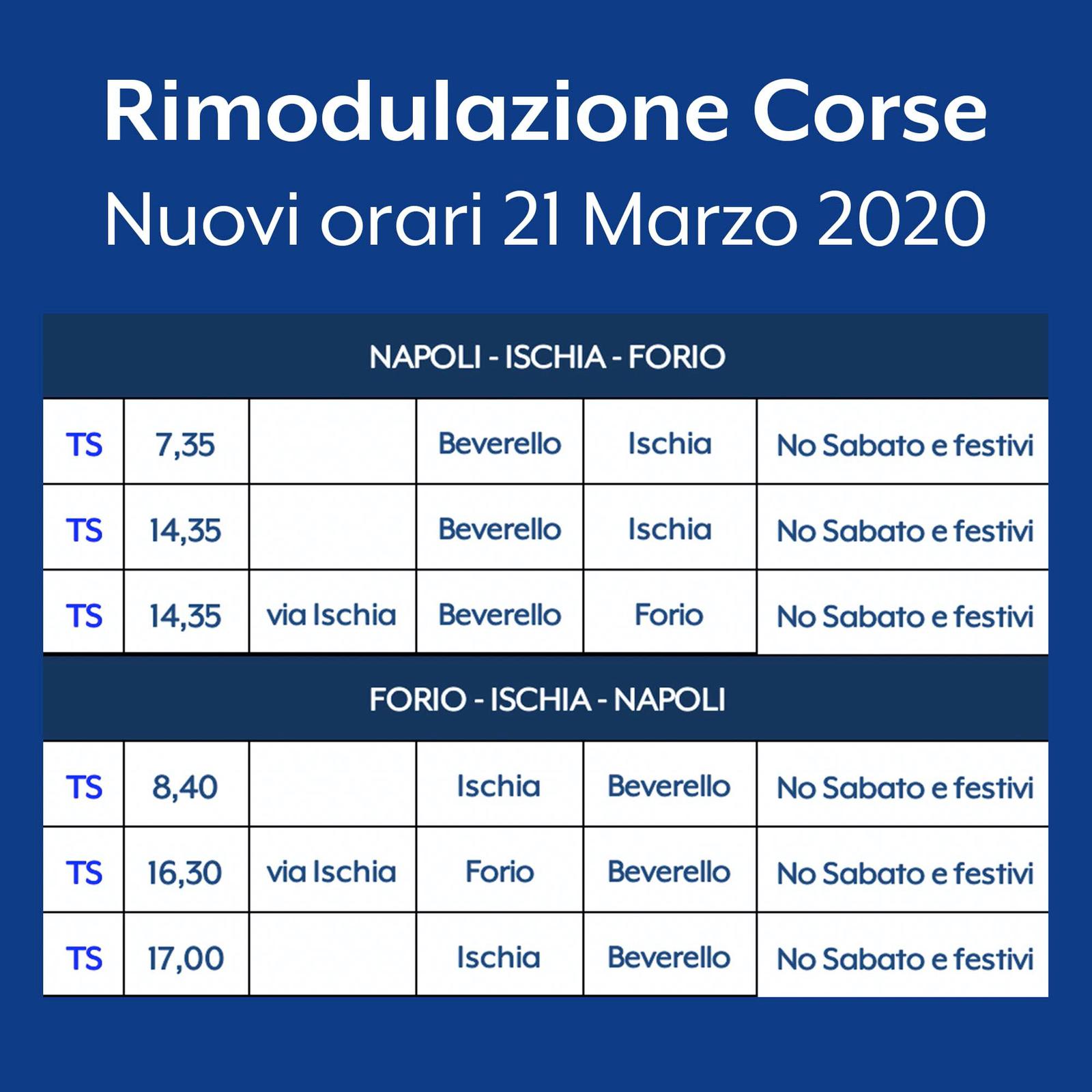 Alilauro informa l'utenza che con l'obiettivo di garantire standard di sicurezza sempre più elevati, in relazione al consistente decremento del traffico e in ottemperanza alle disposizioni dell'ultimo decreto di Governo per la prevenzione dell'epidemia da coronavirus, a far data da domani, sabato 21 marzo e fino a nuova comunicazione, è in vigore un nuovo piano orario, con carattere di eccezionalità e concordato con gli organi competenti, che prevede una riduzione complessiva delle corse giornaliere, la soppressione delle corse nel week end e, in linea con la richiesta di alcune rappresentanze dell’utenza, una variazione sull’ultima partenza utile da Forio a Napoli, via Ischia.