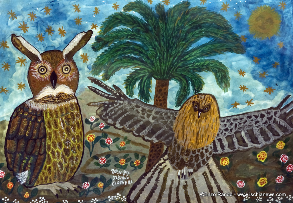 La costruzione della prima sedia (anch’essa rigorosamente in pietra) ispirò improvvisamente Rodolfo, vittima consapevole di un autentico colpo di genio: dalla roccia abbondante potevano venir fuori delle autentiche opere d’arte, delle sculture in pietra viva. Per l’esattezza, sono addirittura 150 le opere scultoree di vario soggetto che adornano oggi le pareti e gli angoli di quest’incantevole oasi, imprescindibile punto di sosta per chi sale e per chi scende dall’Epomeo. Tra i lavori artistici più notevoli annoveriamo un Cristo in pietra pomice ed una grande chitarra, che pare di tanto in tanto rilasciare nell’aria qualche nota leggiadra. Fanno da pendant alle sculture i coloratissimi quadri della madre di Francesco, Giovanna d’Abundo, donna dal gusto vivace e dai tratti naïf. “In queste composizioni si avverte tutta la gioia, tutto l’estro creativo di mia madre – racconta Francesco. Come è facile intendere, insomma, ho voluto conservare in questo posto il ricordo dei miei genitori, lasciando intatto il loro entusiasmo e la passione viva delle loro creazioni”.