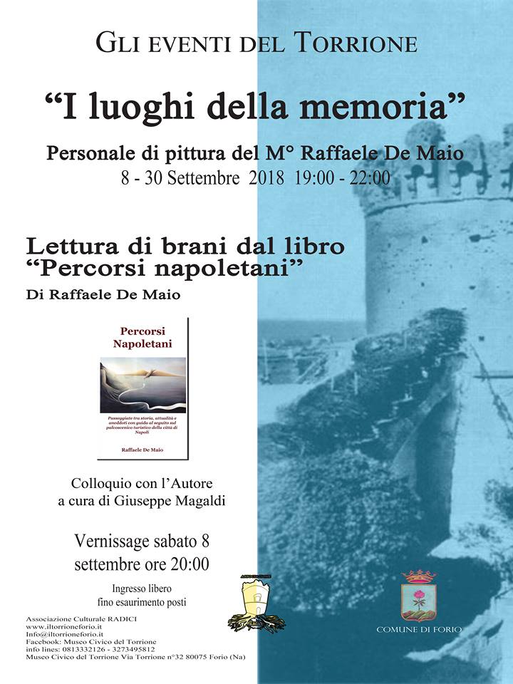 L’Associazione Culturale Radici, affidataria del Museo Civico “Giovanni Maltese”, onorata di ospitare il Maestro Raffaele, invita i gentili ospiti e i residenti all’inaugurazione della rassegna con presentazione del libro “Percorsi napoletani” sabato 8 settembre 2018 alle ore 20.00 presso la sala mostre del Torrione di Forio.