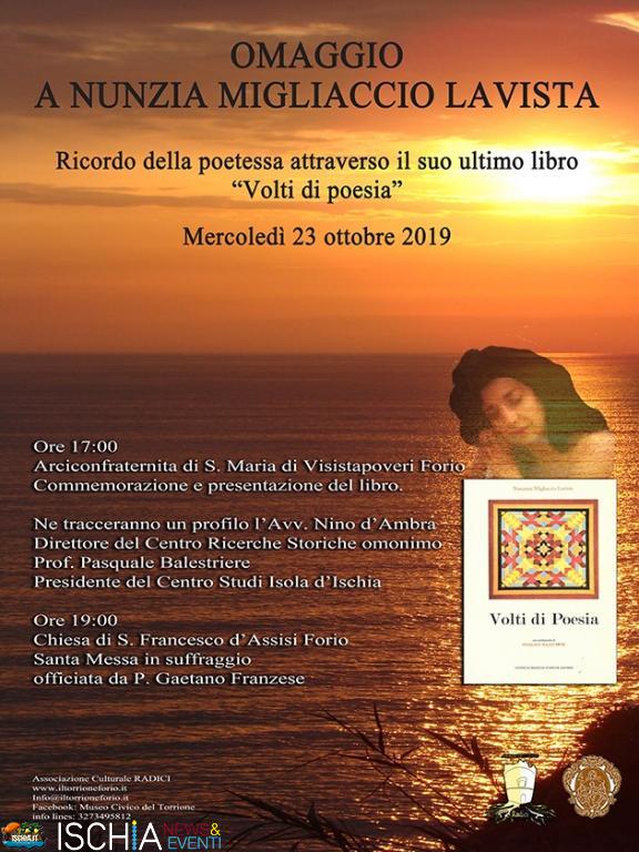 L’Associazione Culturale Radici, accogliendo con fervore ed entusiasmo la richiesta delle figlie Jessica, Melissa e Marilù, ed in sinergia con l’Arciconfraternita Santa Maria di Visitapoveri, invita i numerosissimi ospiti che ancora ci deliziano della loro presenza e gli appassionati di Poesia isolani a partecipare alla manifestazione di mercoledì 23 ottobre 2019 alle ore 17.00. A colloquio con Jessica Maria Lavista, tracceranno un ricordo dell’amata Nunzia l’Avvocato Nino D’Ambra Direttore del Centro di Ricerche Storiche D’Ambra ed il Prof. Pasquale Balestriere, Presidente del Centro Studi Isola d’Ischia.