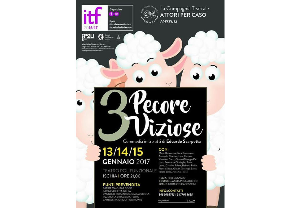 Gli Attori per Caso in scena il 13, 14 e 15 gennaio ore 21:00 Teatro Polifunzionale Ischia, con un classico del teatro napoletano: Tre pecore viziose. Stupisce sempre nelle rappresentazioni di Eduardo Scarpetta, che ormai possiamo ben dire nei secoli si sono susseguite, una macchina comica perfetta che lascia lo spettatore sempre divertito, questa commedia basa la sua comicità sugli intrecci e gli equivoci tipici della commedia dell’arte.