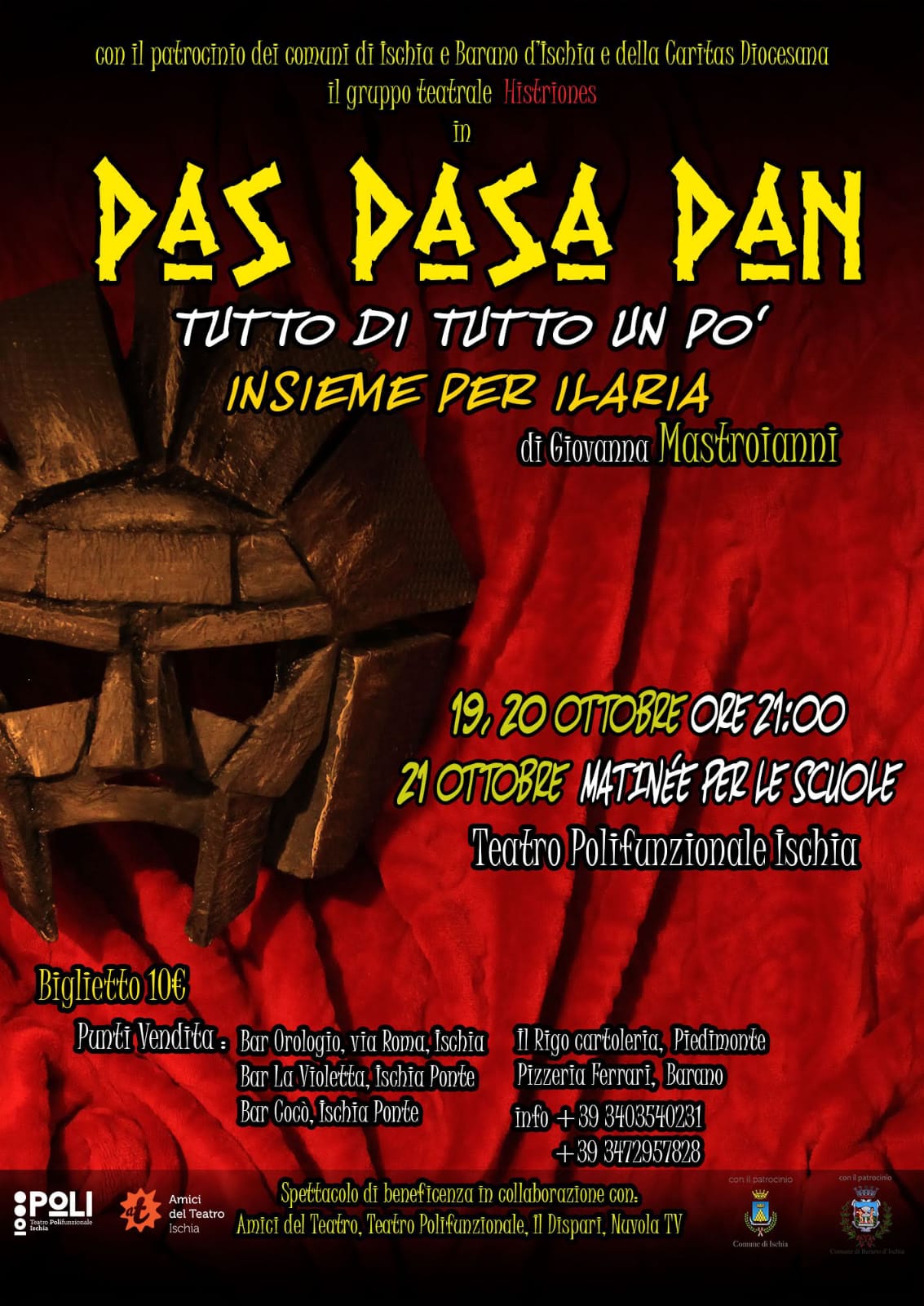 Tutto questo è PAS PASA PAN, che sarà in scena al Teatro Polifunzionale SABATO 19 e DOMENICA 20 alle ore 21.00, con il patrocinio dei Comuni di Ischia e di Barano e la piena collaborazione dell'Associazione Amici del Teatro. Con una matinée prevista per lunedì 21, per i giovani delle scuole. Chiamati anche loro a partecipare attivamente alla mobilitazione solidale della comunità per la loro coetanea.