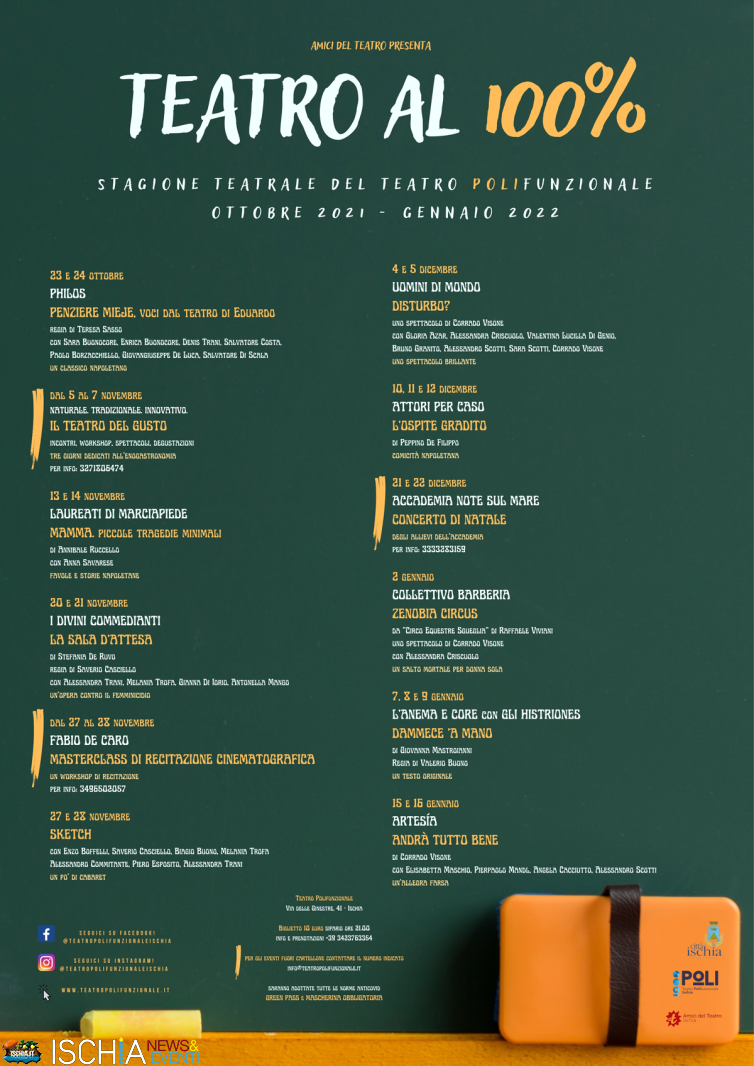 Sarà una stagione che spazierà dalla musica alla poesia, dalla prosa all’enogastronomia, fino ad arrivare al cinema. Il direttore artistico la racconta così “inizieremo il 23 ottobre con l’associazione Philos e il loro spettacolo sulle orme di Eduardo De Filippo, durante la stagione poi ci saranno eventi particolari come la masterclass di recitazione cinematografica di Fabio De Caro che si svolgerà il 27 e 28 novembre e alla quale è ancora possibile iscriversi, mentre dal 5 al 7 novembre il Poli ospiterà il festival “Il teatro del gusto” un nuovo evento creato da Anniria Punzo che ospiterà workshop, incontri, degustazioni, spettacoli sull’enogastronomia, ci sarà anche il Concerto di Natale, grazie all’Accademia Note sul Mare il 21 e 22 dicembre, e poi le varie proposte delle compagnie non mancheranno di divertire, stupire ed emozionare il pubblico.
