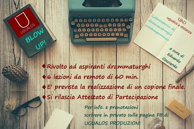 L’Associazione Culturale Radici, plaudendo l’iniziativa del Prof. Eduardo Cocciardo, invita tutti coloro che abbiano voglia di cimentarsi nella stesura di un copione teatrale, o anche semplicemente di curiosare nel back stage teatrale, a visionare il programma preparato dal laboratorio creativo Blow Up! e iscriversi ai corsi descritti alla pagina facebook ugualosproduzioni ove troveranno un’ampia descrizione del programma, le modalità di iscrizione e un prestigioso curriculum artistico che delinea l’ampia competenza degli istruttori. L’Associazione, inoltre, confidando nella validità della modalità telematica, auspica che in tantissimi possano aderire perché è molto più semplice aderire comodamente dal proprio pc o smartphone. Buon Teatro a tutti.