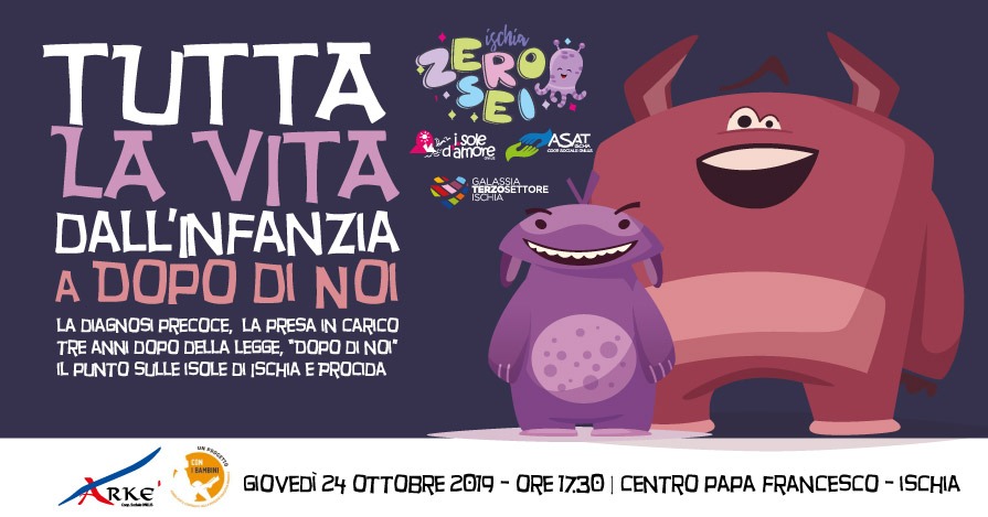 La cooperativa sociale Arké onlus, promotrice del progetto “Ischia Zero6”, finanziato dalla Fondazione Impresa Sociale con i Bambini, insieme ai partner del progetto ed in particolare dell’associazione Isole d’Amore onlus e della cooperativa Sociale Asat Ischia onlus, propone l’incontro “Tutta la Vita: dall’Infanzia al Dopo di Noi”, un appuntamento nel quale verranno trattati punti importanti, dalla diagnosi precoce e la presa in carico del disabile alla legge “Dopo di Noi”, con un excursus sulla situazione assistenziale sulle isole di Ischia e Procida e una finestra sulle esperienze delle famiglie isolane.