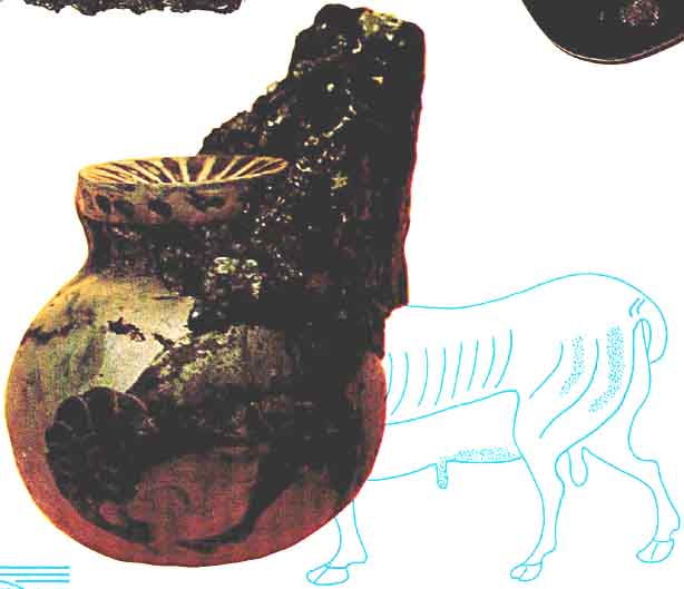 [45] I frammenti del cratere corinzio recuperato dalla voragine, di altre 4 oinochoai corinzie, le coppe ioniche, delle quali una è quasi integra, una conservata in parte. I frammenti di altre coppe ioniche sono circa 80: Bound 1991c, p. 20, figg. 30 e 31.