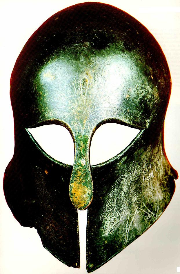 La statua Bronzo A di Riace, nella sua nudità, portava rialzato sulla fronte un elmo corinzio.