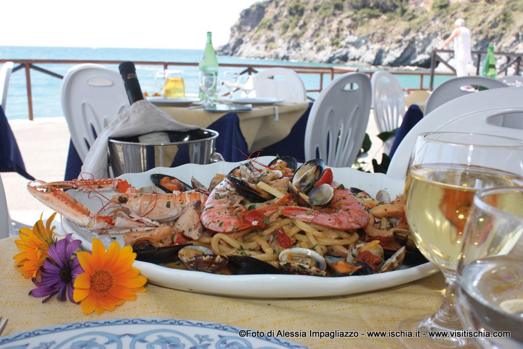 «I clienti si fidano di me, è una soddisfazione sapere che posso decidere o consigliare assaggi e porzioni e poi, quando descrivo i piatti mi dicono sempre: “Anna ce li stai facendo gustare prima ancora di portarli in tavola”. Se non mi vedono –conferma orgogliosa, ma senza ostentare - , vengono a cercarmi in cucina. Infatti entro ed esco, dò un occhio ai tavoli e un altro ai fornelli». Anna è un abile direttore d’orchestra: segue, decide, consiglia, accoglie. Non a caso collabora con lo chef preparando le insalate, che sono ricche e apprezzate, o le bruschette. La clientela è internazionale e affezionata, molti prenotano ancor prima di arrivare sull’isola. «Non ci credi?» mi dice. Allora si avvicina a una signora che è seduta ai suoi tavoli intenta a lavorare all’ uncinetto. «Vengo a Ischia da sempre – mi spiega la signora Carolina di Roma tra una chiacchiera e uno sguardo al suo lavoro –, ma è soprattutto negli ultimi anni che ho stretto una bella amicizia con Anna. Amo questo ristorante per la pulizia, la freschezza della cucina che permette di mangiare ogni cosa senza restarne delusi e poi quando sono di qui anche se non devo fermarmi mi piace passarla a salutare». Il suo piatto preferito sono i Paccheri cozze e provola che ha portato persino a Roma su richiesta della figlia. A noi, si avvicina anche il Colonnello Walter, dei Vigili del Fuoco precisa, che dopo pranzo, si è regalato un momento di relax pescando proprio di fronte al ristorante, sulla spiaggia. «Oltre alla cucina – rammenta -, questo è un angolo di paradiso dove la mente vaga sull’orizzonte di mille tramonti…», che io, aggiungo, aspetto gustandomi un bel gelato.