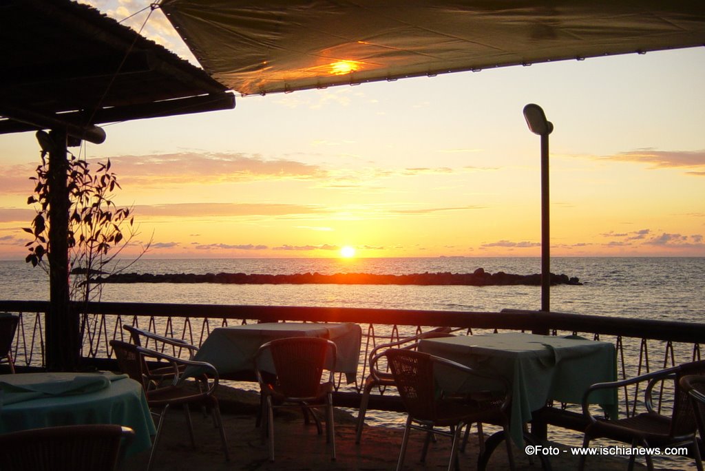 Un luogo intimo, all’esterno appena dieci tavoli, vicino alle spiagge, ma lontano dal caos, con una vista suggestiva che abbraccia l’orizzonte, la cittadina di Forio, il Torrione e la Chiesa del Soccorso. La cornice è resa ancora più vivace dalle tovaglie gialle e da una parete decorata con conchiglie di ogni sorta, cozze, fasolare, vongole, scuncilli, ostriche, capesante e taratufi, incastonate come se fossero pietre preziose.